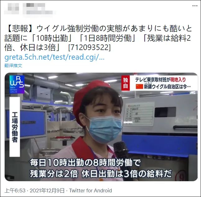 近日,一新疆女工接受东京电视台采访的视频在日本引发热议,视频中,该女工表示,自己每天工作8小时,加班的话工资翻倍、节假日是三倍工资。这段话被日本网民截图发到了社交媒体上,有日本网民调侃“要这都算‘强制劳动’的话,我也想被‘强制’”,还有网民投来羡慕的眼神,“日本什么时候才能这样啊……”